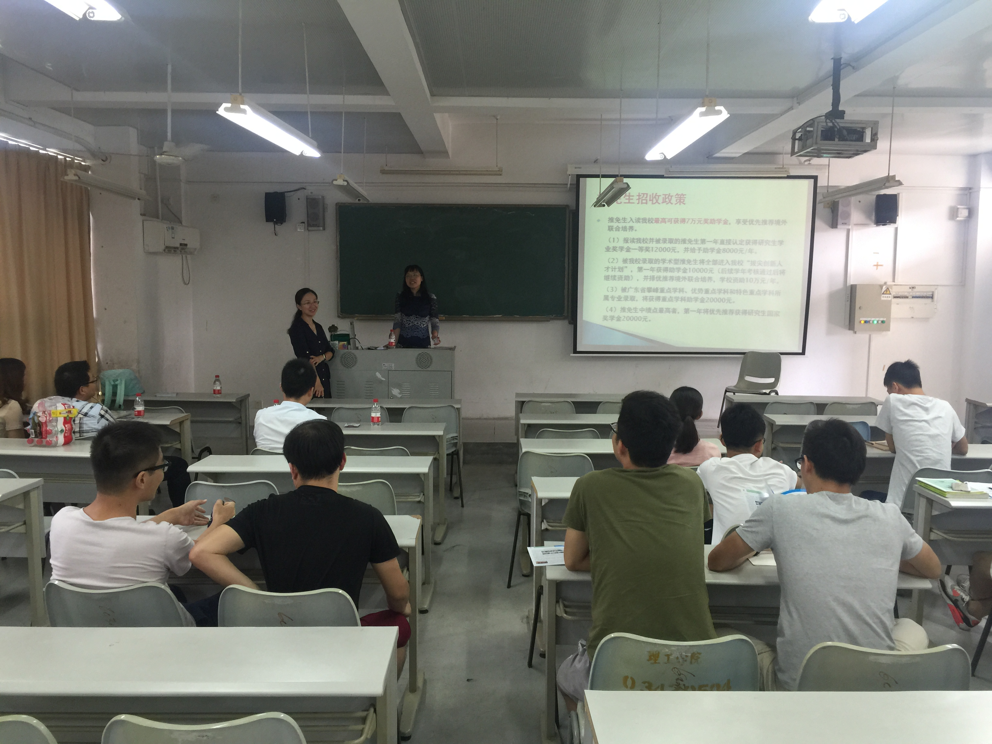 2017年9月26日上午10点,广东工业大学轻工化工蘑菇视频 院长助理郑育英教授和研究生办公室马巍老师在我校研究生办公室工作人员陪同下,来到教学楼6C302为蘑菇视频 的考研学子展开招生宣讲。