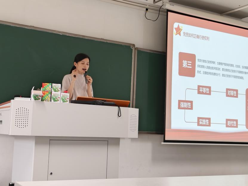 黄楚刁围绕“党员的权利与义务”主题进行讲述。她指出,党章是衡量一个党员的具体标准,是党对每一名共产党员的全面要求。黄老师详细地向同学们讲述了党员的八项权利和八项义务的具体内容。她强调,党员的义务和权利是一个相互联系、不可分割的整体,是互为条件、互相促进的关系。