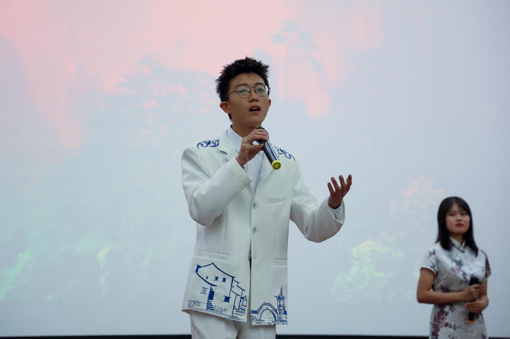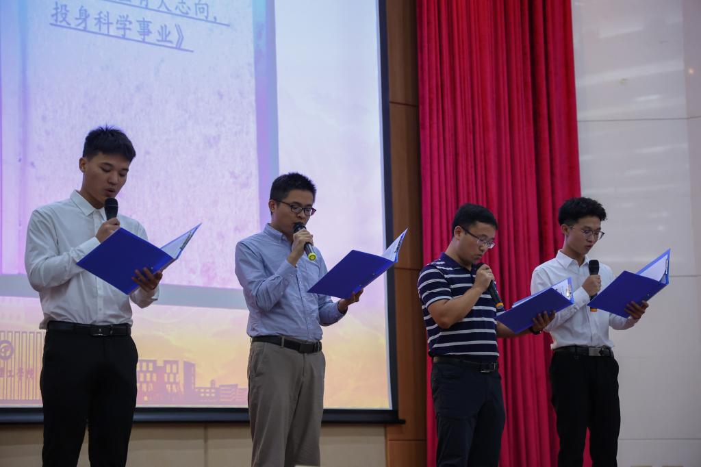 优秀班主任代表何运兵博士、刘鉴博士以及今年获得国家奖学金的学生代表李世德和罗彬辉,师生四人诵读了科学经典文章《朱道本:青年人应有大志向,投身科学事业(节选)》。他们分享了学习和参赛的经验,朗诵了我国著名的有机化学、物理化学家,中国科学院院士朱道本的文章,表达了老一辈科学家对青年的期望,展现出一份青年人应有的的爱国主义精神与责任担当。