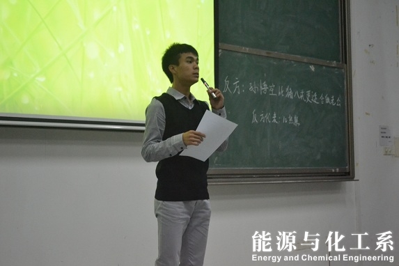 2012年11月18日19:00,在6E306,我能源与化工系迎来了期待已久的辩论赛与心理剧,我们有幸邀请到学院辅导员谢真葵老师、来自机械辩论队的邹建能师兄和凌瑞旺师兄做为本次活动的嘉宾与评委出席,在这激动的时刻,心理剧演员们为了把最好的一面展现给我们,都紧张地预演着,而我们辩论赛的辩友们也在紧张有序地准备着,是啊,他们总是时刻准备着。叮,7点到了,大家安静了下来,因为比赛正式了,首先出场的正反双方进行了简单的自我介绍,便进入了状态,他们自信地陈述着自己的观点,进入攻辩环节与自由环节时是如此的激烈,经过机械学院师兄的意见与建议,辩友们受益匪浅,认识到了自己的许多不足,相信在以后的学习和辩论生涯中会更上一层楼。接下来的正反双方更是激烈,几番唇枪舌战,时不时引起观众热烈的掌声。