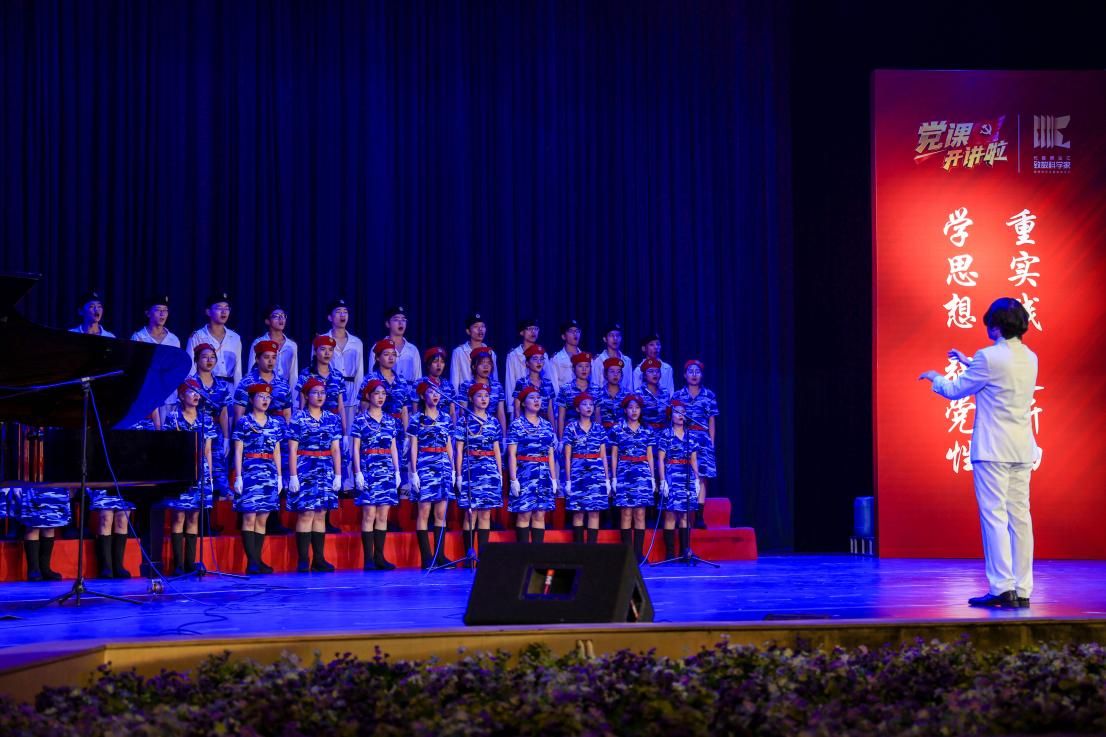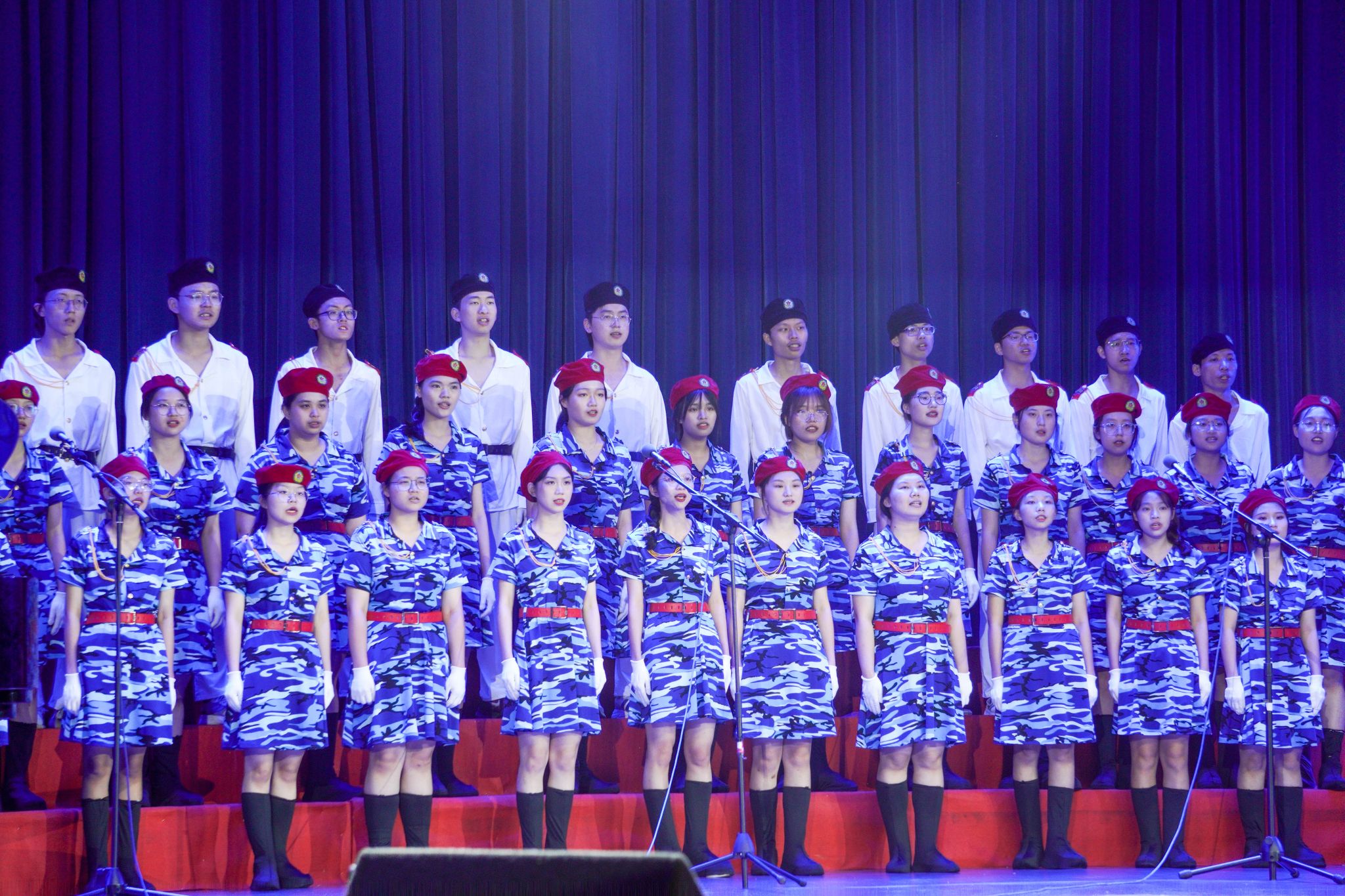 合唱队学生身着蓝色迷彩裙和白色海军服,化身探索星空与大海的精灵,共同演绎《光荣与梦想》和《夜空中最亮的星》两首歌曲,歌声时而激昂豪迈,时而婉转多姿,唱出了中国人民从站起来、富起来到强起来的豪情壮志,革命前辈们的信念犹如夜晚中的星星引领我们前行。