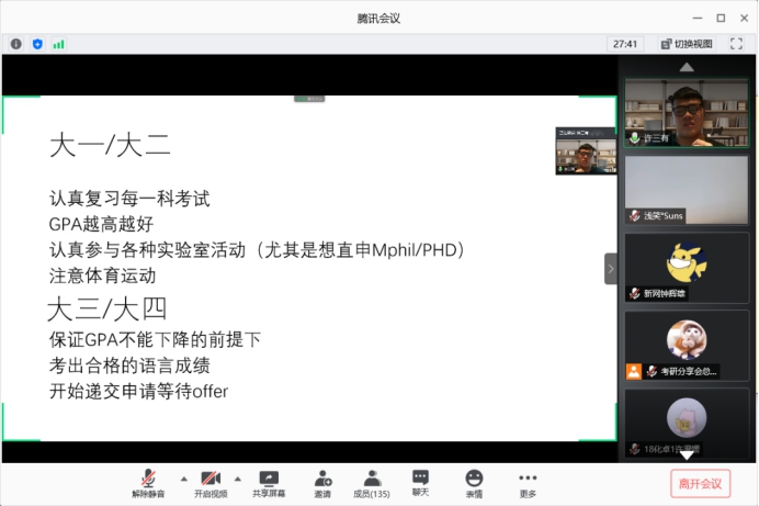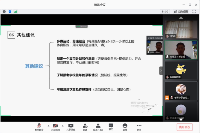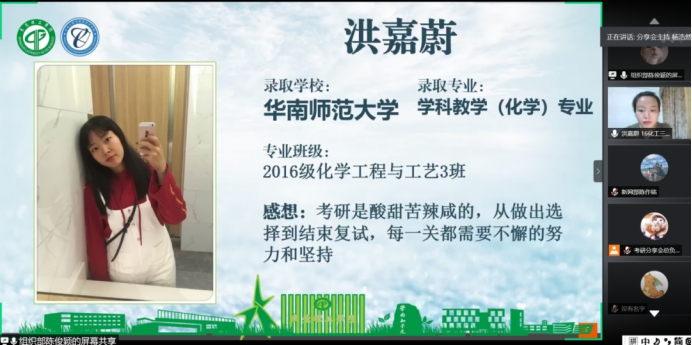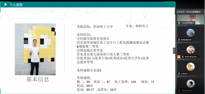 将以线上的形式在腾讯会议举行2020年考研经验分享会,请到了今年考研成功的优秀学长学姐们为同学们进行关于考研的事项的讲解,分析考研形式,同时解答同学们的一些考研上的疑惑。本次分享会分为上午和晚上两场,共邀请了2016级化学工程与工艺3班洪嘉蔚、2016应用化学(卓越计划)1班郭志成等11位成功考研的学长学姐进行分享。蘑菇视频