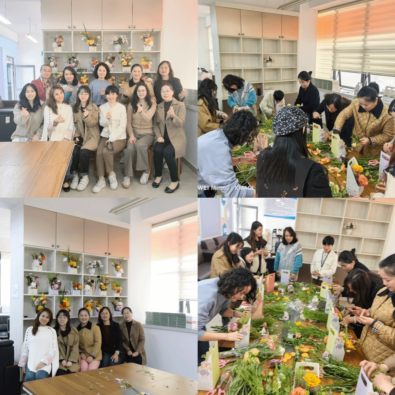 分工会组织学院女教职工在教工小家开展“聚巾帼力量 建美丽莞工”活动。为活跃学院文化氛围,陶冶职工情操,本次活动为体验传统插花艺术,并邀请了专业花艺老师现场教学。女教职工们在花艺老师的带领下,结合各自手中的鲜花特点和审美情趣,一边交流一边实践,现场氛围轻松而愉快。