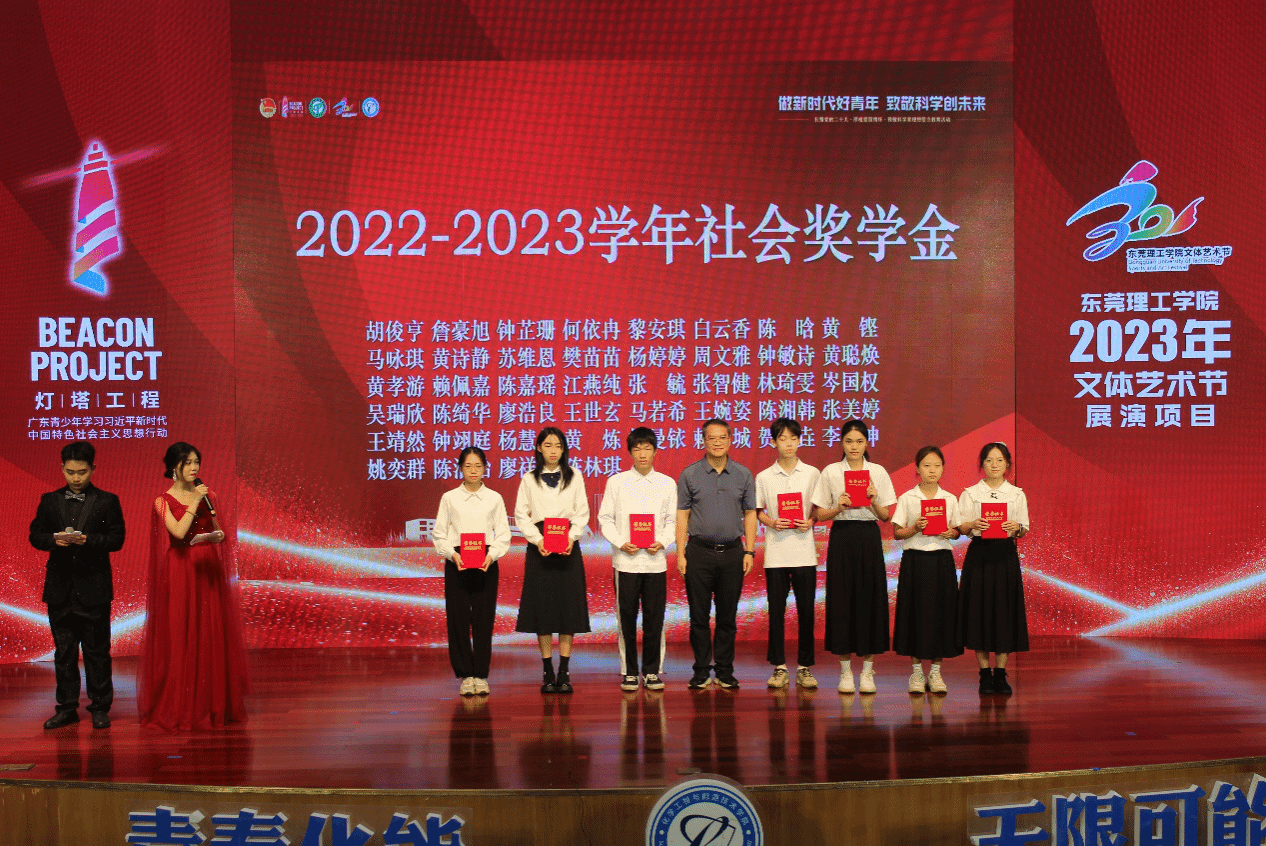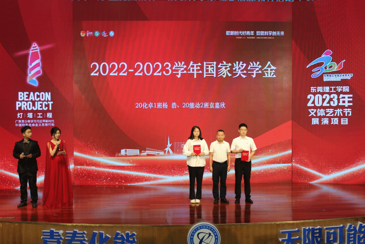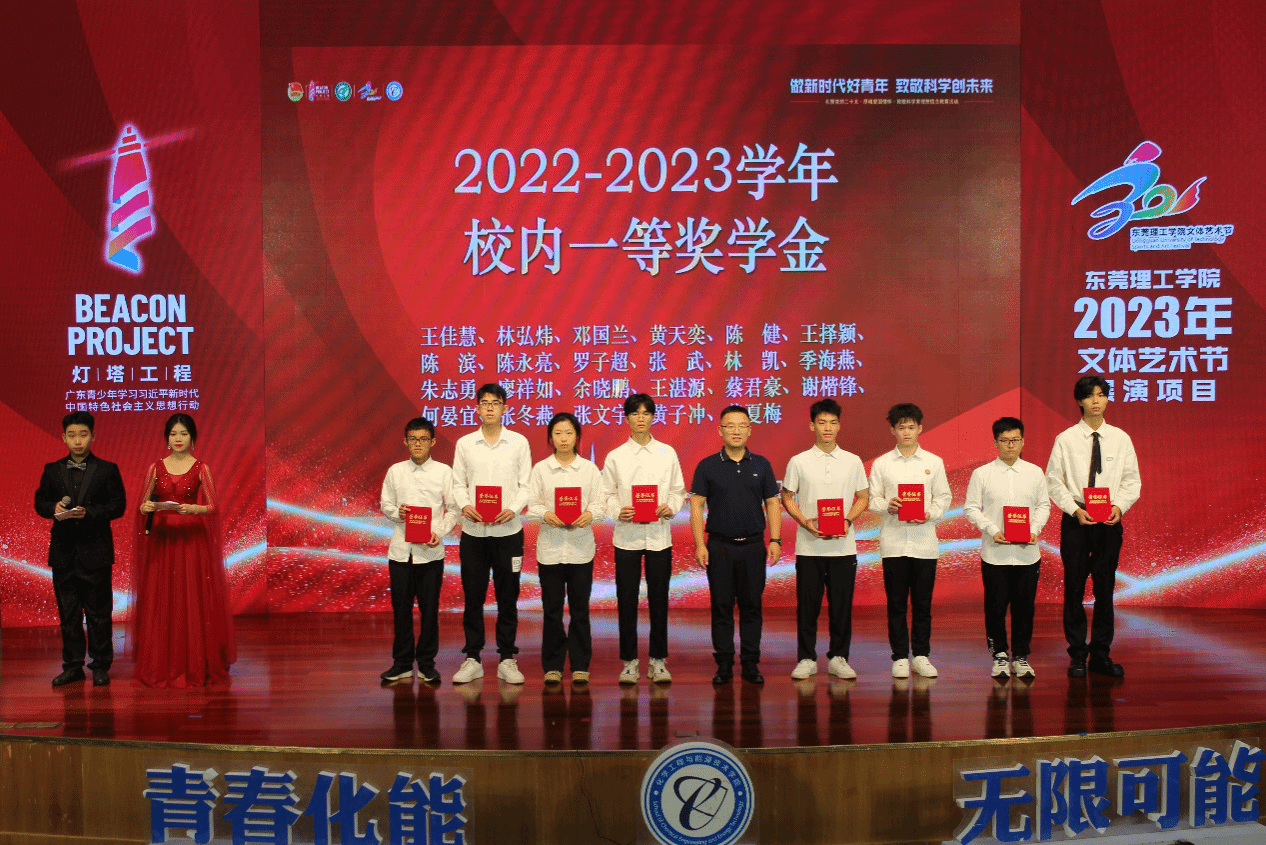 党委书记尹辉斌,副院长黄斯珉、张刚、何运兵,党委副书记杨方以及受邀到场的企业嘉宾东莞市能源投资集团有限公司能源研究院常务副院长、东莞新锋光伏能源科技有限公司总经理李三军,东莞海丽控股集团有限公司总经理赵海红分别为获奖学生颁奖。荣获社会助学金和校内一等奖学金的22级化卓1班廖祥如同学表示,非常感谢学校和老师的培养,将继续努力、接续奋斗,与时代同行,争做有为青年,成为更优秀的自己!现场新生观众23级能动1班黄政豪同学看到台上受到表彰奖励学长学姐们,表示要向榜样学习,做新时代好青年,致敬科学创未来。