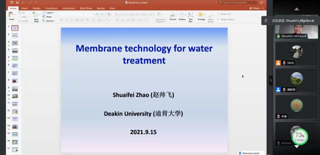 第一门国际讲座是黄斯珉老师邀请的迪肯大学赵帅飞教授为同学们介绍了用于水处理的常见膜分离技术。这些膜分离技术主要包括反渗透、正渗透、纳滤、超滤、微滤等。主要介绍了这几种膜分离的特征、优缺点以及应用范围等。该讲座让师生了解到膜分离技术的历史、研究现状和未来,实用性较强,引起了学生对探索科学和致力于新技术研发的兴趣。