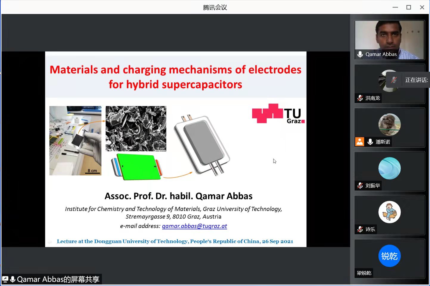 第三门国际讲座是由何运兵老师邀请的波兹南理工大学的Qamar Abbas教授为同学们讲授了混合超级电容器电极的材料和充电机制,Abbas教授结合他开发的带有碘充电纳米多孔碳和高表面积双电层的新型电池电极为同学们分析了典型的双电层电容器和混合超级电容器的区别,并介绍了超级电容器的优良性能。内容深入浅出,互动环节,同学们也积极参与其中,与Abbas共同探讨。