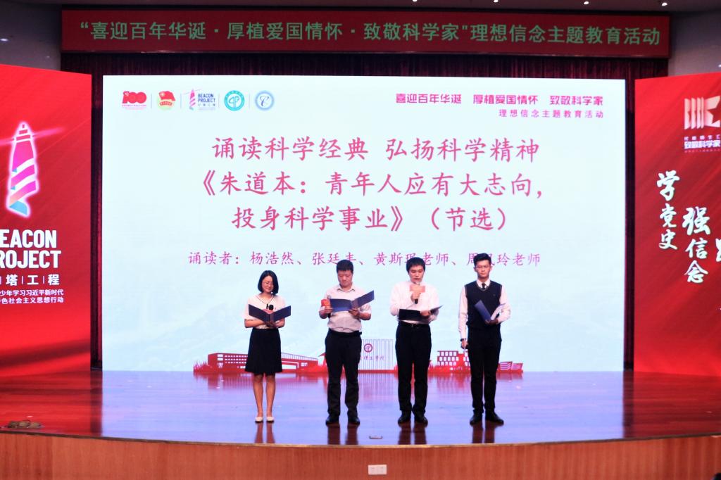 团委书记刘哲老师和王欣、陈子豪等八名学生代表演绎了情景朗诵《干惊天动地事、做隐姓埋名人》。“一件件大国重器的成功研制,撑起了中华民族伟大复兴的坚强脊梁!”一句句慷慨激昂的诵词,道出万千学子对科学家的敬仰之意!