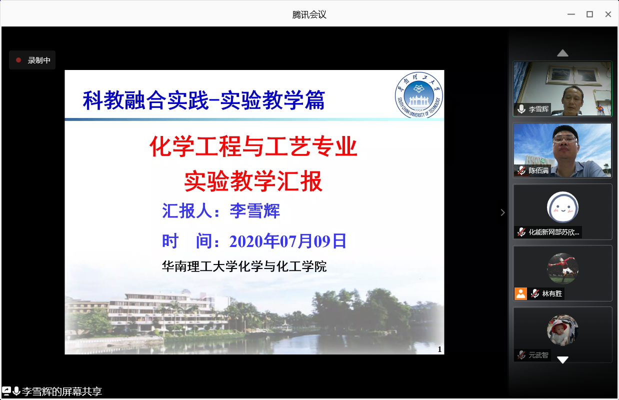 “落实‘三全育人’ 建设一流本科”教学教育大讨论之线上专题研讨会以腾讯会议的形式举行,此次会议特邀华南理工大学化学与化工学院副院长李雪辉教授为全院教师分享“科教融合-实验教学篇”相关内容。