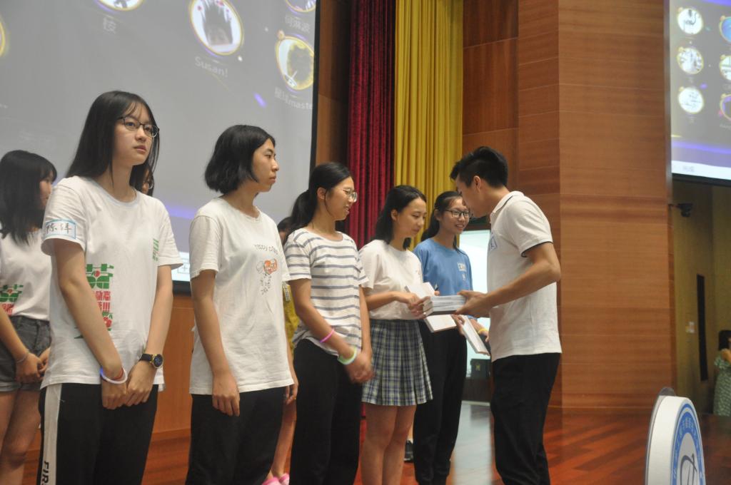 一开场便是YMCA协会带来了时尚舞台走秀,几位风格各异的高颜值女生让人眼前一亮。要说全场最好玩的节目,当属《兔子舞》无疑。领舞人先是上台示范了兔子舞的跳法,随后,老师、助班们开始踢踢踏踏,手扶前面的人的肩膀,一蹦一蹦地跳起兔子舞。现场有近80%的人加入了兔子舞的队伍,一条长长的队伍在学术会议中心的多功能厅转了三层同心圈,如同一条长龙。