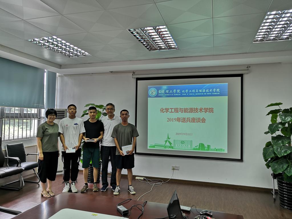 在会议室12L103举行2019年送兵座谈会。学院党总支书记夏勇、党总支副书记柳卓君、学工办负责人谢真葵,以及蘑菇视频