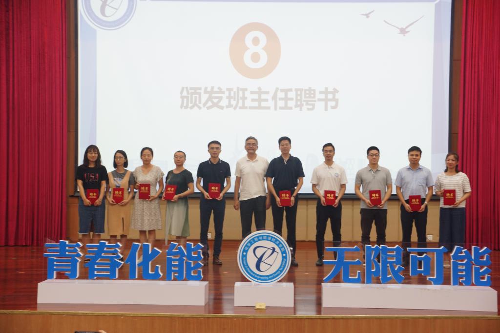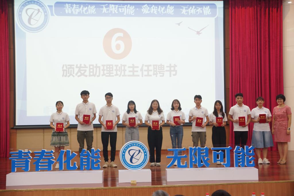 同辈导师学生干部登台亮相,作为高年级的师兄师姐,助理班主任和化能团学干部分别登台展示风采表示对新生的欢迎,党总支副书记柳卓君为助理班主任颁发聘书并合影留念。