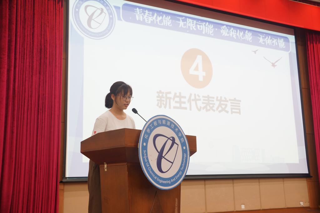 19级能源化学工程专业的新生代表刘宇珠登台发言,她表示,大学生应该做到“喝水不忘挖井人”。饮水思源,现在的美好生活,离不开党和国家。爱国爱党,是大学生的责任与使命。弘扬爱国主义精神,从身边做起,从小事做起。