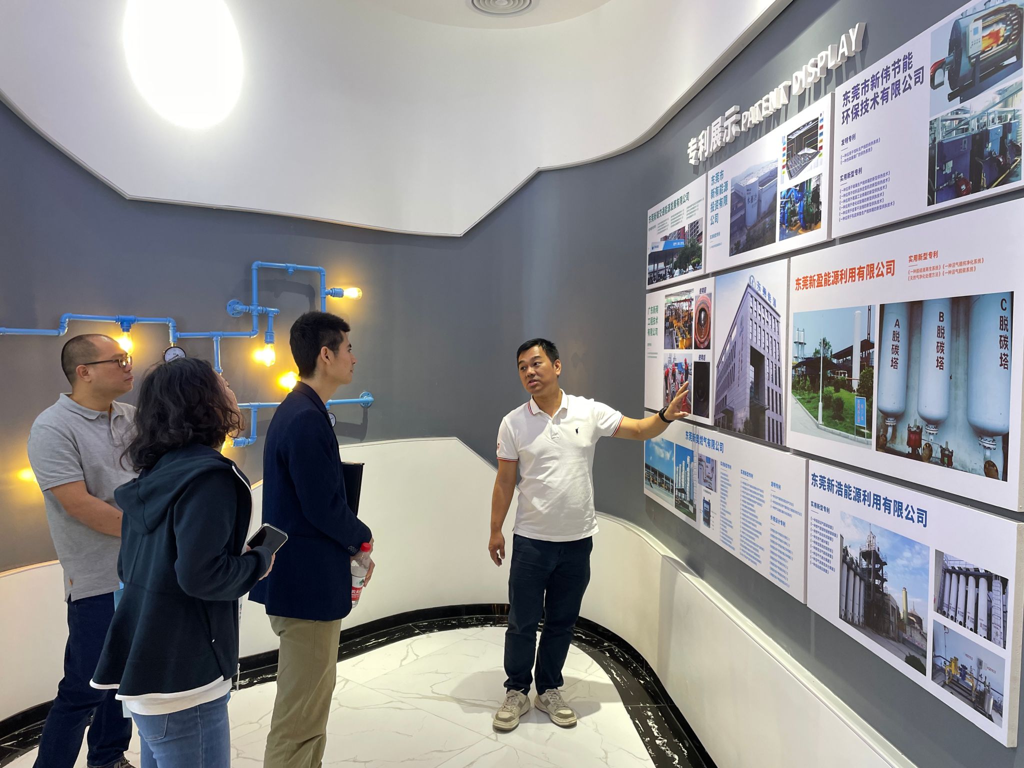 东莞市新有能源投资有限公司工程技术部经理刘松胜、东莞新锋光伏能源科技有限公司工程部主管苏志盛对蘑菇视频 一行到来表示热烈欢迎,带领大家参观了能源研究院展览厅,重点介绍了公司的发展布局、现有项目情况及主要成果。