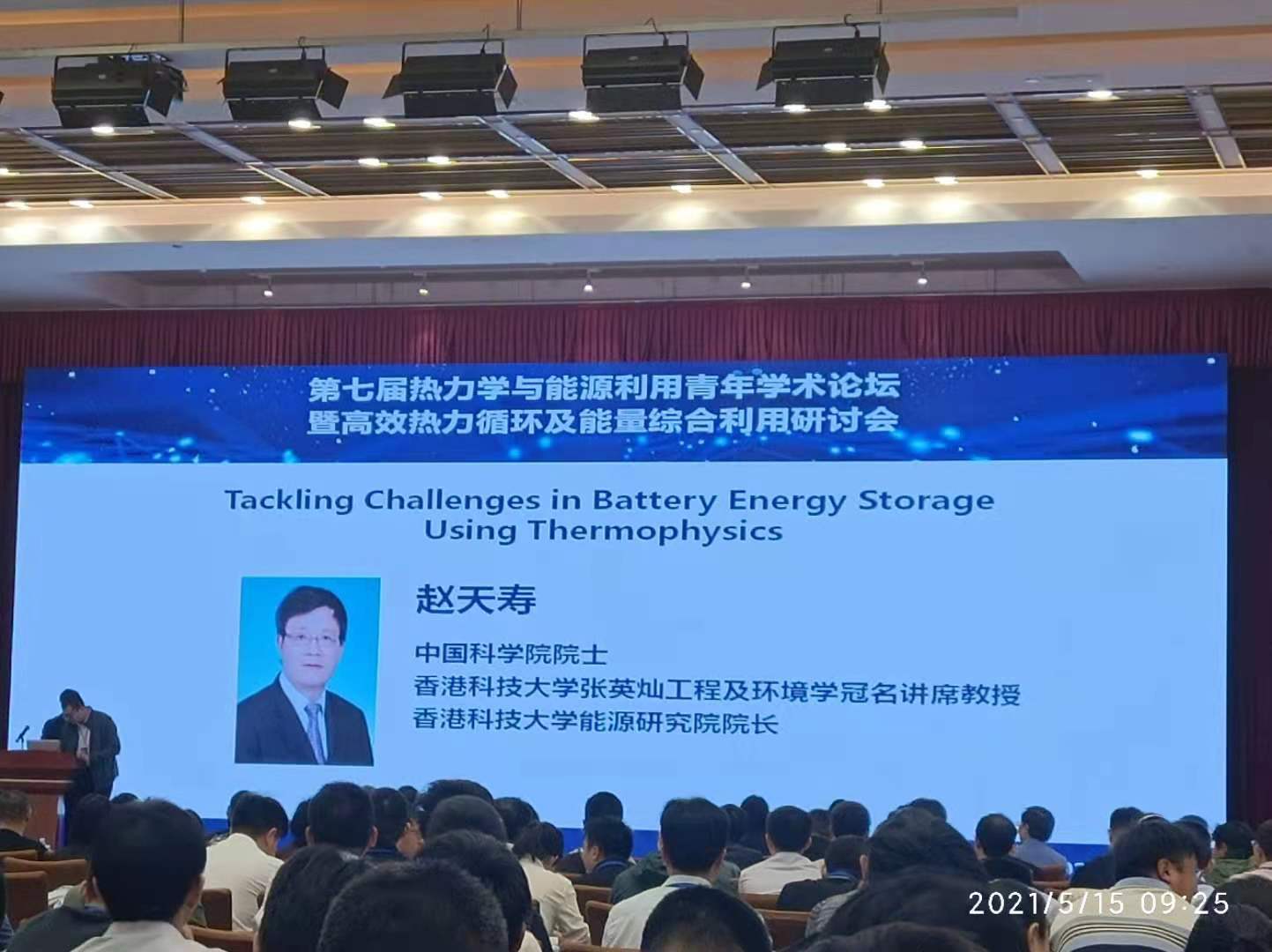 中国科学院院士,香港科大能源研究院院长赵天寿教授作了题为“电池储能中热物理与电化学耦合的关键科学问题”的专题报告。赵天寿院士指出,电池储能,特别是流体电池(燃料电池,液流电池,金属空气电池),是实现新能源规模化利用的有效途径之一,其性能的突破及成本的降低需要热物理与电化学交叉的理论与方法。通常,流体电池由电化学活性材料、离子导体及电子导体三个关键材料构成,其工作过程涉及在复杂界面上的电化学反应和在空间中的多相多组分传输。电化学反应速度,也就是电池性能,一方面取决于界面电化学反应特性,而另一方面,还取决于空间传输特性。这两个方面,一个属于电化学的研究范畴,一个属于热物理的研究领域。在早期的研究中,电化学领域主要研究材料的表面特性与微观形貌,以提高电化学活性,但忽略了传输特性对反应速度的影响。而另一方面,热物理领域着重于空间传输特性的研究,未涉及到界面电化学动反应力学与传输的相互作用关系。这样就导致了界面上的电化学反应与空间能质传递脱节问题,限制了相关理论的完整性与实用性,阻碍了流体电池的发展。因此,我们需要以热物理与电化学学科交叉为主线,研究电池工作过程中能质传输与电化学反应间的本征相互作用规律,构建热物理与电化学交叉的理论,提出新方法,以实现电池储能技术的突破。