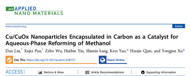 2023级能源动力硕士研究生潘旭佳以共同第一作者在国际知名期刊《ACS Applied Nano Materials》(中科院2区)上发表题为“Cu/CuOx Nanoparticles Encapsulated in Carbon as a Catalyst for Aqueous-Phase Reforming of Methanol”学术论文,徐勇军教授和姚锞子博士为共同通讯作者,蘑菇视频
