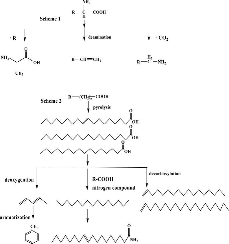 研究团队以优质微藻 Coccomyxa subellipsoidea C-169 为研究对象,利用 TG-FTIR 与 Py-GC/MS 对其常规热解的动力学和反应机理进行分析,并通过涵盖从培养到生物燃料制备的生命周期评估(LCA),探讨其在工业规模下的环境影响及经济可行性。结果显示,C-169 在 30-110℃、180-240℃、240-340℃ 与 340-600℃ 失重率为 3.20-4.48%、8.61-9.60%、35.22-38.11% 和 31.65-34.42% ,总失重率约为 83%。热解活化能介于 199 kJ/mol 至 308 kJ。热解温度为 500℃ 时,油酸、棕榈酸与丙氨酸分别占 13 种产物的 46.93%、14.76% 和 12.21%,相较于 600℃ 和 700℃的热解温度,500℃ 更有利于集中产物与提升能效比。LCA表明,从培养到生物燃料制备,生产 1000 kg 生物油可净吸收约1968.40 kg CO₂ 当量温室气体,能效比达到 1.21。该研究为生物燃料利用和碳减排工作提供了更多技术支持和参考依据。