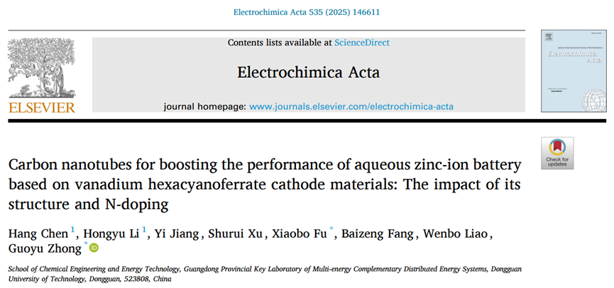 2023级能源动力硕士研究生李宏宇以共同第一作者在国际知名期刊《Electrochimica Acta》(中科院2区)上发表题为“Carbon nanotubes for boosting the performance of aqueous zinc-ion battery based on vanadium hexacyanoferrate cathode materials: The impact of its structure and N-doping ” 创新研究成果,陈航博士为共同第一作者,傅小波教授和钟国玉副教授为共同通讯作者,蘑菇视频
